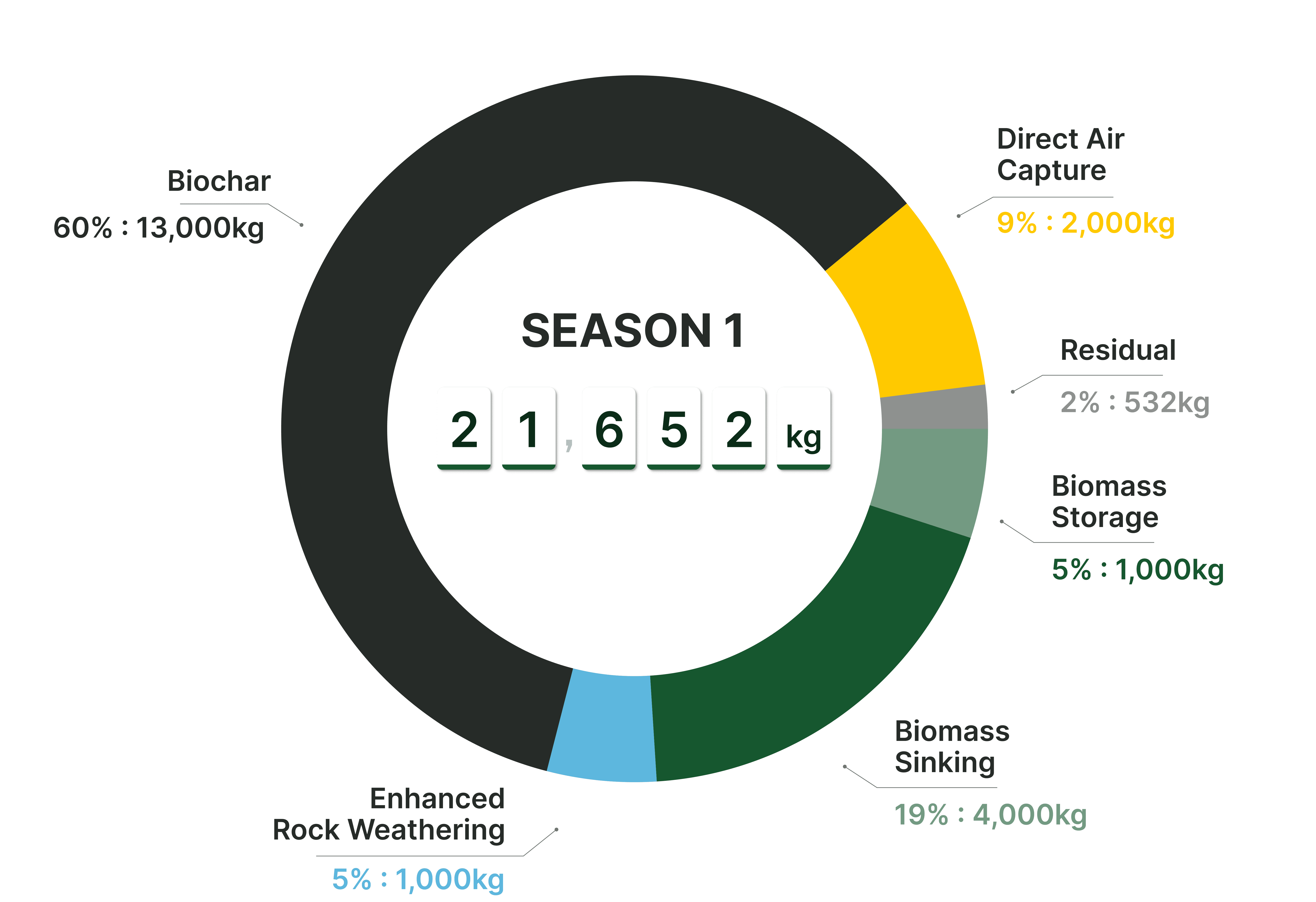 In Season 1, we generated 21,652kg of greenhouse gas cleanup. We’ve committed 21,000kg, leaving a remainder of 652kg. This happens because we buy removal in whole tonnes. At £0.25 per kg, that’s £163 left over - which we’re rolling into Season 2 to keep the impact going.